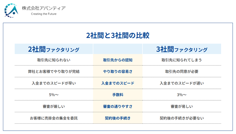 アバンティアのファクタリング|2社間手数料・3社間手数料