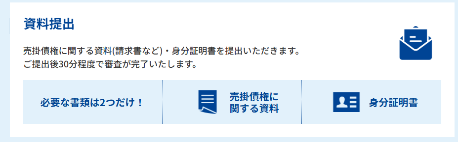 「①売掛債権に関する資料(請求書など)」と「②身分証明書」です。ご提出後30分程度で審査が完了いたします。