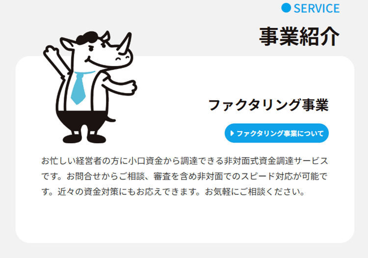 500万以下の小口専門ファクタリングサービスで非対面でも成約ができるので、中小企業様や個人事業主で少額希望の方におススメだと思います。金額にもよりますが審査時間もかなり短いので審査の結果もすぐにわかります。