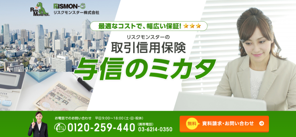 与信のミカタは与信管理サービスなどを提供するリスクモンスター株式会社が運営する売掛保証サービスです。運営母体が与信管理を行なっているため、与信に強い取引信用保険です。