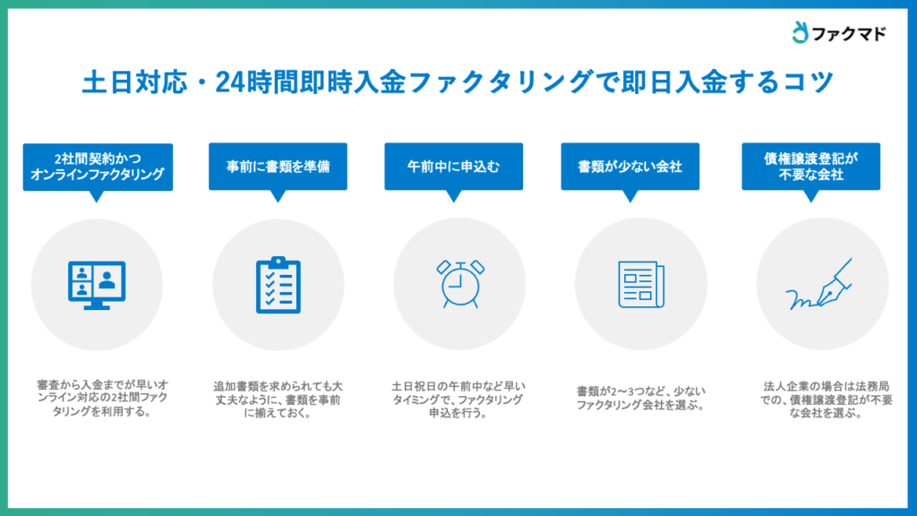 AIファクタリングや完全オンラインファクタリング対応の場合は、審査・入金スピードが早いため即日入金にはおすすめです。