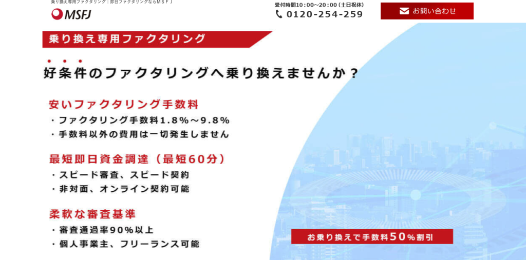 株式会社MSFJはファクタリング手数料が1.8〜から利用が可能で、手数料以外の費用は発生せず、乗り換えで手数料を50%割引を行っている好条件のオンライン完結ファクタリング会社です。