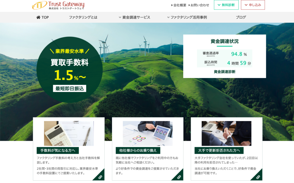 トラストゲートウェイは福岡で地域密着の営業を行っており、手数料も1.5%〜と非常に安いファクタリング会社です。審査通過率は94.8%と高く、他社乗り換えも歓迎しています。