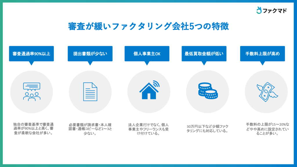 個人事業主でも利用ができ審査が甘い・緩い・提出書類が少なめなファクタリング会社の特徴は下記の5つです。