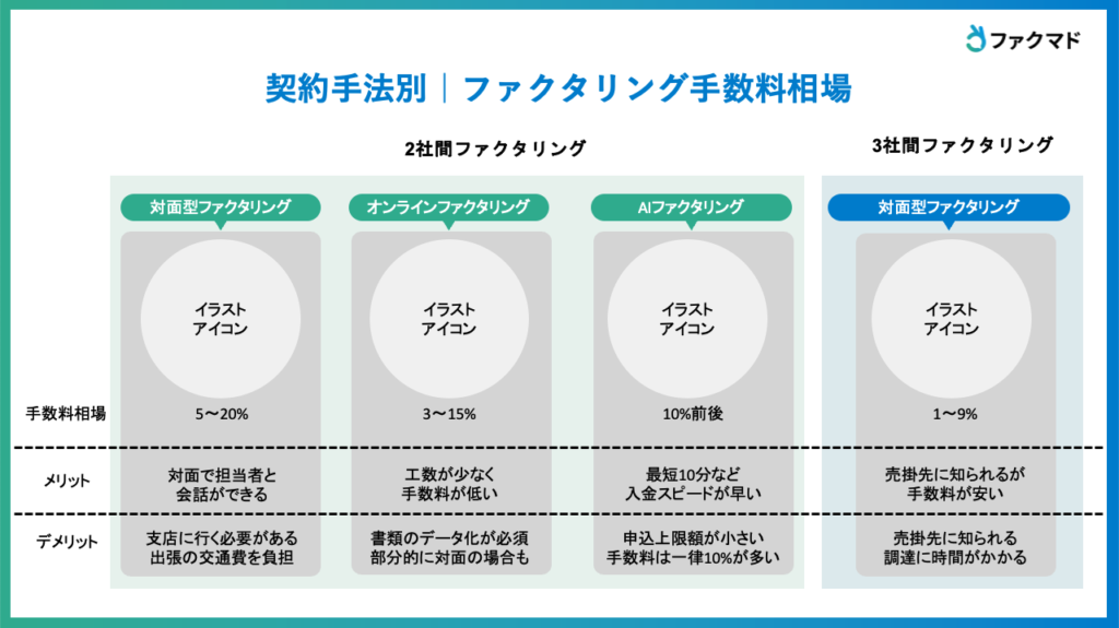 ファクタリング会社からすると上記のような架空請求詐欺や、回収した売掛先の流用といったリスクを抑えられます。そのため手数料は一般的にやや低めに設定されており、3社間ファクタリングの手数料相場は1〜9%と言われています。