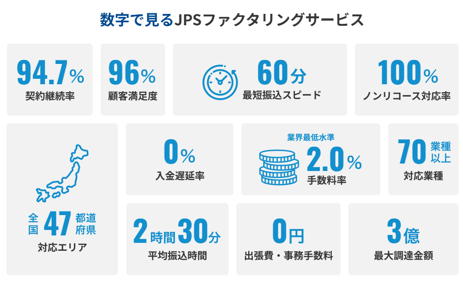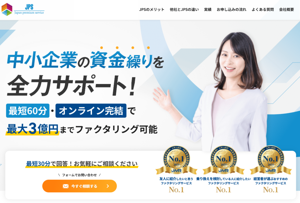 JPS 法人限定 | 95%以上 | 2%~ | 最短1時間 審査時間30分 | 〜3億円 | 本人確認書類/通帳コピー 請求書/決算書 |
