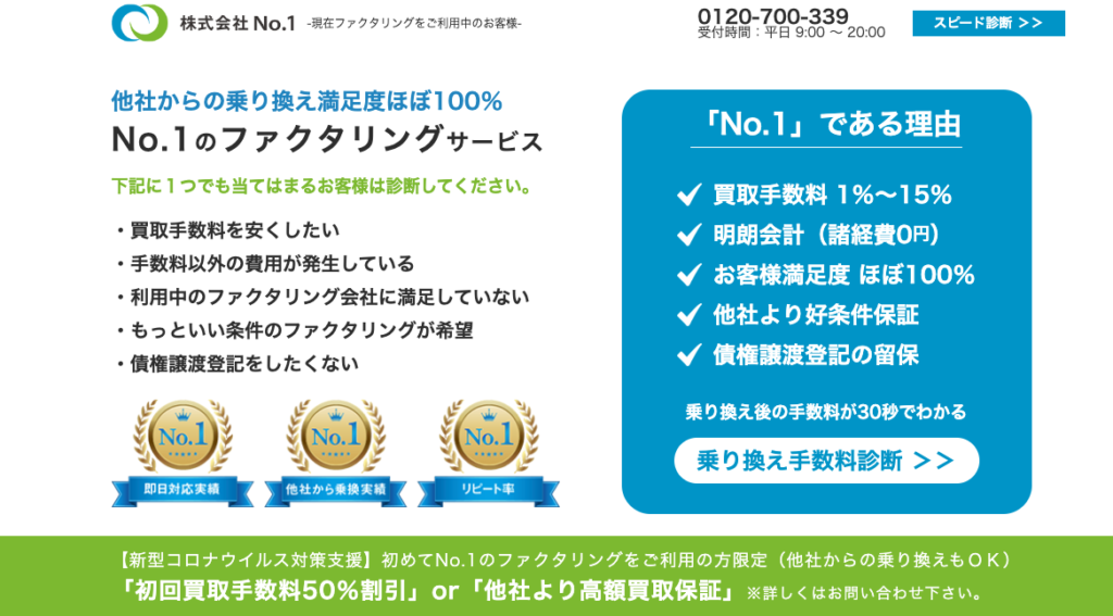株式会社No.1は名古屋営業所があり他社利用中の乗り換え満足度がほぼ100%で、諸経費が0円・債権譲渡登記が不要なオンライン完結ファクタリング会社です。