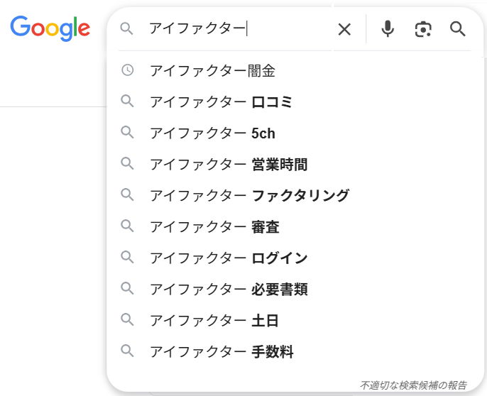 アイファクターと検索すると「アイファクター闇金」「アイファクター 口コミ」「アイファクター 5ch」「アイファクター 営業時間」「アイファクター ファクタリング」「アイファクター 審査」「アイファクター ログイン」「アイファクター 必要書類」「アイファクター 土日」「アイファクター 手数料」なども検索補助として表示されてます。