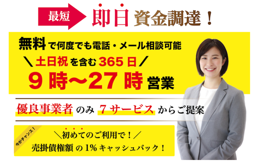 またはじめてファクタリング利用する方向けに、売掛債権金額の最大1%がキャッシュバックされるキャンペーンも行っているため、安く利用したい方におすすめです。