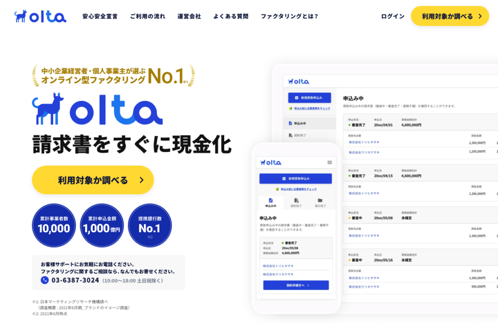 OLTA(オルタ) は中小企業経営者・個人事業主が選ぶオンライン型ファクタリングでNo.1のAIファクタリングです。