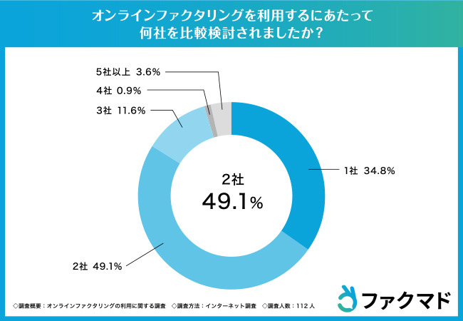と、オンラインファクタリングを利用するにあたって、多くの利用者が複数の会社を比較検討していることがわかりました。「2社を比較検討した」が49.1%と最も多く、「3社を比較検討した」方も11.6%と1割を占めています。