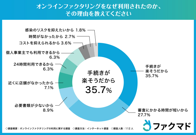 はじめに、「オンラインファクタリングをなぜ利用されたのか、その理由を教えてください」と質問したところ、「手続きが楽そうだから」が35.7%で最も多い回答でした。