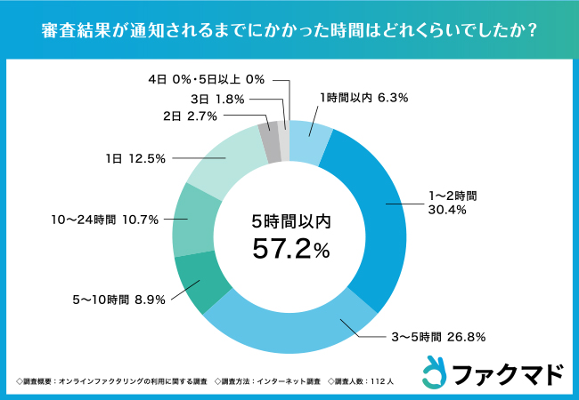 「審査結果が通知されるまでにかかった時間はどれくらいでしたか?」と質問したところ、オンラインファクタリングの審査結果は非常に早いことがわかりました。特に、「1〜2時間」が30.4%と「3〜5時間」は26.8%と非常に多く、57.2%を占めています。