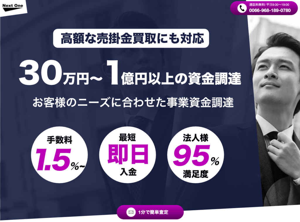 ネクストワン 手数料1.5%〜/30万から買取/最短即日入金/オンライン完結ファクタリング