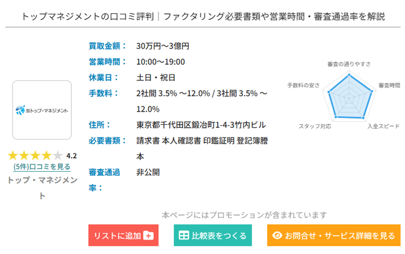 トップマネジメントの口コミ評判|ファクタリング必要書類や営業時間・審査通過率を解説より引用。
