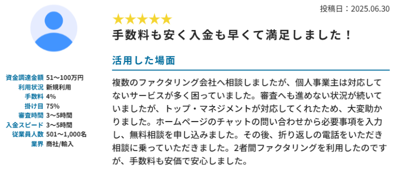 複数のファクタリング会社へ相談しましたが、個人事業主は対応してないサービスが多く困っていました。審査へも進めない状況が続いていましたが、トップ・マネジメントが対応してくれたため、大変助かりました。ホームページのチャットの問い合わせから必要事項を入力し、無料相談を申し込みました。その後、折り返しの電話をいただき相談に乗っていただきました。2者間ファクタリングを利用したのですが、手数料も安価で安心しました。