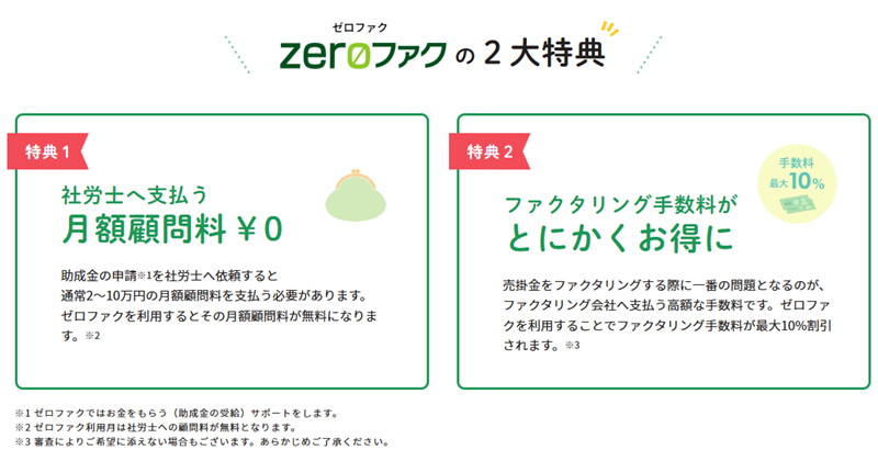 通常の2社間ファクタリング・3社間ファクタリングのファクタリング手数料が最大で10%も優遇され、助成金受給までに掛かる月額顧問料もタダになるので助成金を獲得したい方、キ ャッシュローを改善したい方、従来のファクタリングに不満を抱えていらっしゃる方には非常にお勧めのサービスです。