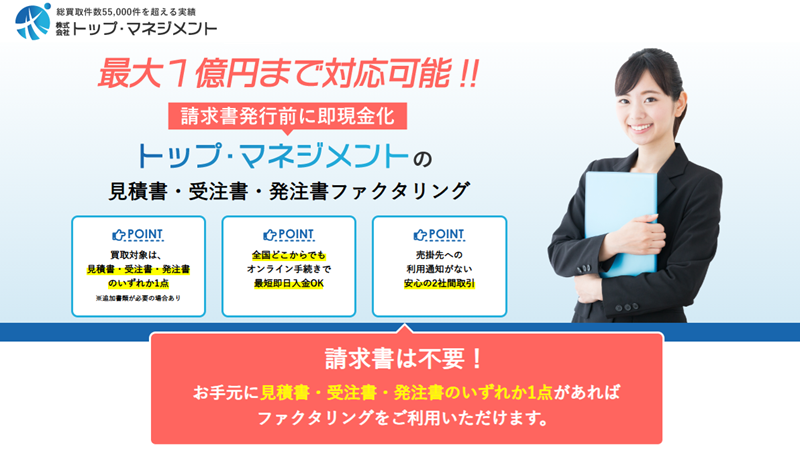 ファクタリングサービスの多くは必要書類・審査書類として請求書が必要ですが、株式会社トップ・マネジメントが提供するファクタリングサービスでは、【請求書は不要!お手元に見積書・受注書・発注書のいずれか1点があればファクタリングをご利用いただけます。】とされております。