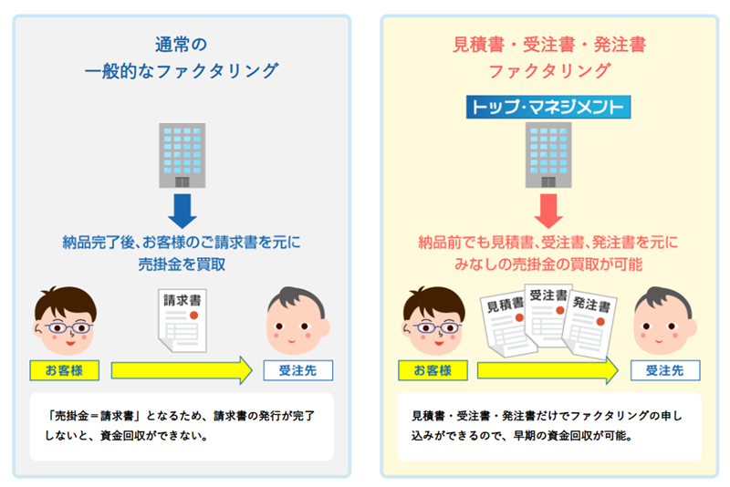 トップマネジメントの見積書・受注書・発注書ファクタリングとは?請求書がなくても「見積書or受注書or発注書」で即日調達が可能なファクタリングサービスです。通常のファクタリングサービスは請求書発行後に発生した売掛債権を売買しますが、見積書・注文書・発注書ファクタリングでは、お仕事の注文や発注を受けた段階、更には見積りの段階でもファクタリングが行なえる画期的な新サービスです。これにより製造業やシステム開発や印刷業など、お仕事を受注してから納品完了までの期間が比較的長い業種の経営者様はもちろん、請求書の発行前に資金繰りしたい経営者様の早期資金調達が可能となります。