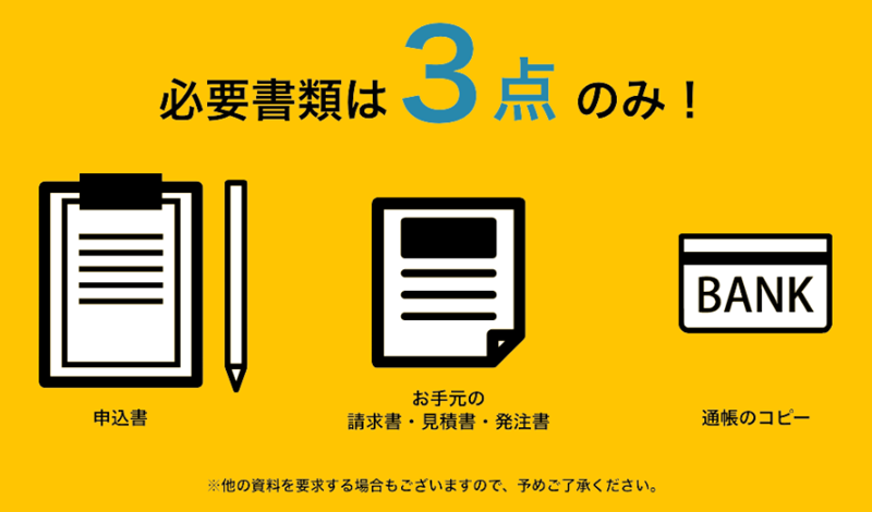 ※請求書以外の見積書・発注書・受注書での審査をご希望される場合、取引先様(請求先)は「月商500万円以上」「設立半年以上」の「法人様」に限らせていただきます。