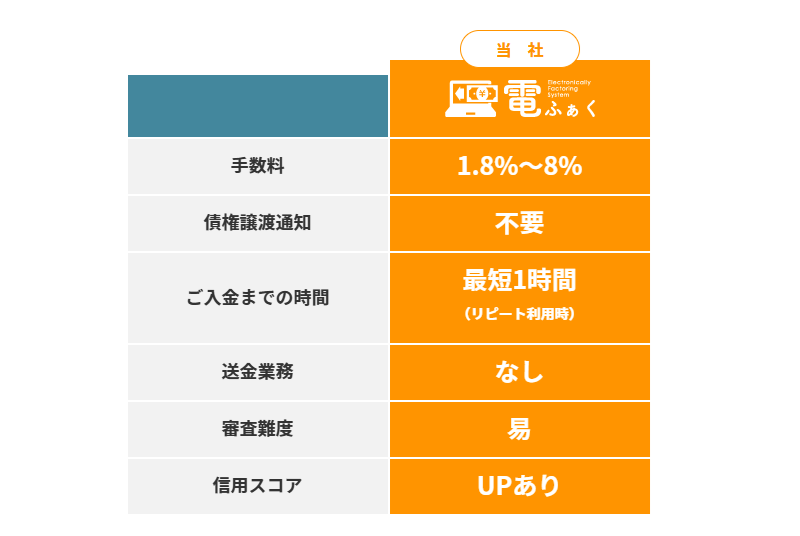 そこで、緊急でのファクタリング需要にもご対応させて頂く為に電ふぁくを継続利用前提のお客様に限り、口座開設前の段階でも電ふぁく適用手数料(1.8%~8%)にて最短当日の資金化をお約束します。
